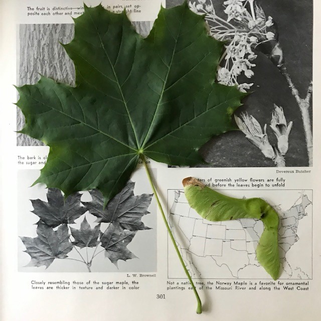Norway Maple’s winged pair of seeds, samaras, spread more horizontally when hanging, and the seed flat. The Sugar Maple’s samaras are downward-oriented when hanging, and the seed is round rather than flat.