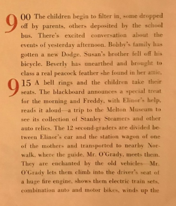 “Do you think we should let Mr. O’Grady know that we like the tour?” They do, so Bobby passes out paper and everyone writes a thank-you note. Elinor aids the cause of courtesy by printing hard words like automobile, electric, transportation on the board. Some of thee children wax exuberant, close with “love and kisses” to Mr. O’Grady but Elinor lets these pass. “The important thing,” she says, “is that they learn that it’s nice to express appreciation – the exact form doesn’t matter.”