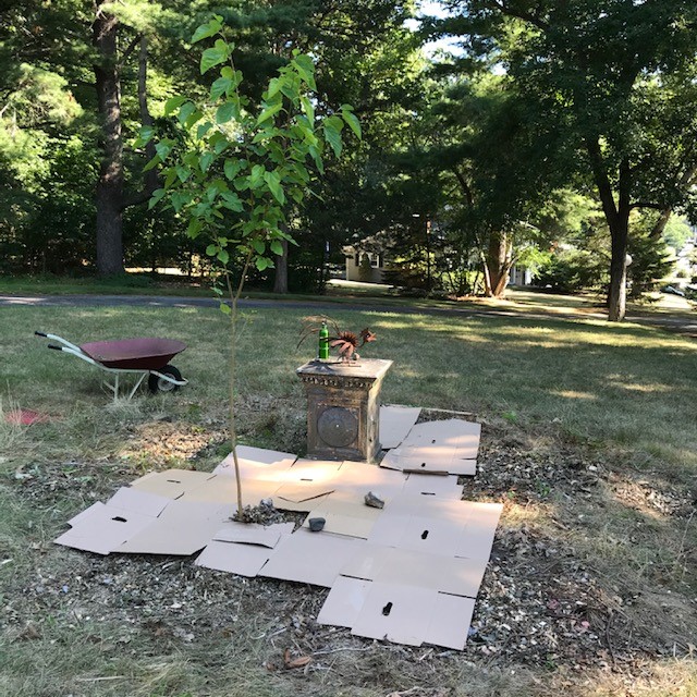 This morning, August 4, I began to do some sheet mulching ’round the mulberry bush.’ I started work early, while the front yard was still in shade. The first step in this process was to lay down sheets of cardboard and place newsprint under the gaps and holes. I soaked the layer with a garden hose. This layer will prevent the grass, brambles and weeds from growing back, so we can replant with berry bushes, herbs and clover.