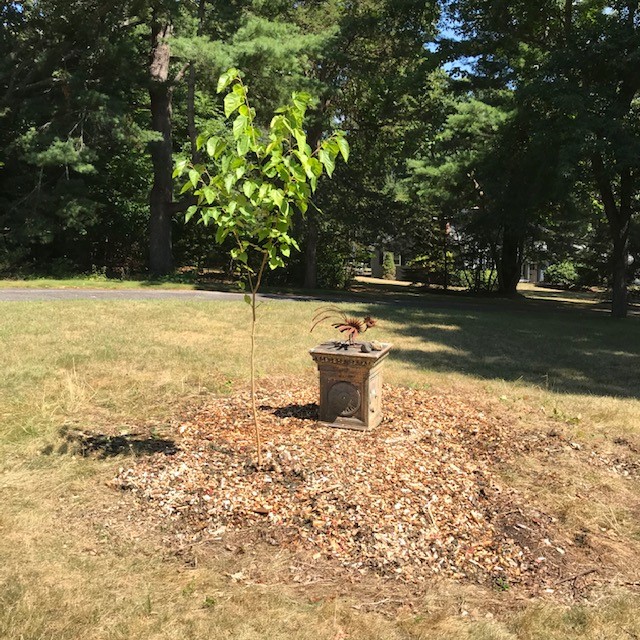 Back on July 1, I began cutting down the ornamental shrubs in the center of the front yard to clear the space and replant it with something ornamental and edible – sweet cherry, mulberry and fig trees. Many years ago, the area had been planted with an azalea, two rhododendrons and some yews. The rhododendrons had been slowly dying, and the yews had been devoured by grazing deer. Wild raspberries, brambles, and a large tuft of ornamental grass were beginning to overtake the area, while two black cherries saplings and three white pine sprouts had taken root among the yews. I removed the black cherry and white pine first. Then as I cut away the yew and azalea branches, I found a hidden treasure – two mulberry saplings.