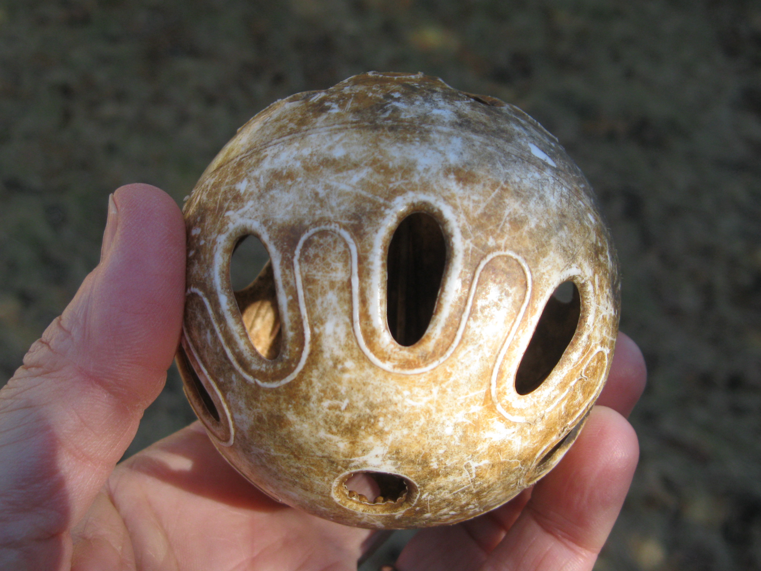 Measuring 1-2 inches, the coin-shaped yellow-gold or silvery-colored shells of this mollusk are a treasure from the sea. I knew the Toenail Shell by another, a more fanciful, name. What was it? I couldn’t remember. Oh, well. Then as we continued walking along the shore, I spied a ball – a very odd ball. It was metallic-colored and perforated with two rows of oblong holes, like a big jingle bell. I picked it up, only to discover it was a plastic wiffle ball that had acquired a tarnished gold appearance from a thin coating of algae.