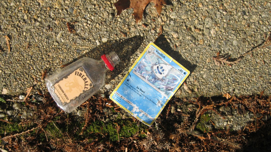 Further down the sidewalk, I noticed a small liquor bottle, called a nip. On the label was a character that looked like the Devil and some words. The “RED HOT” nip once held some Fireball Cinnamon Whisky. Cinnamon? Pokemon. The Inside was a frozen flash of crystallized water.