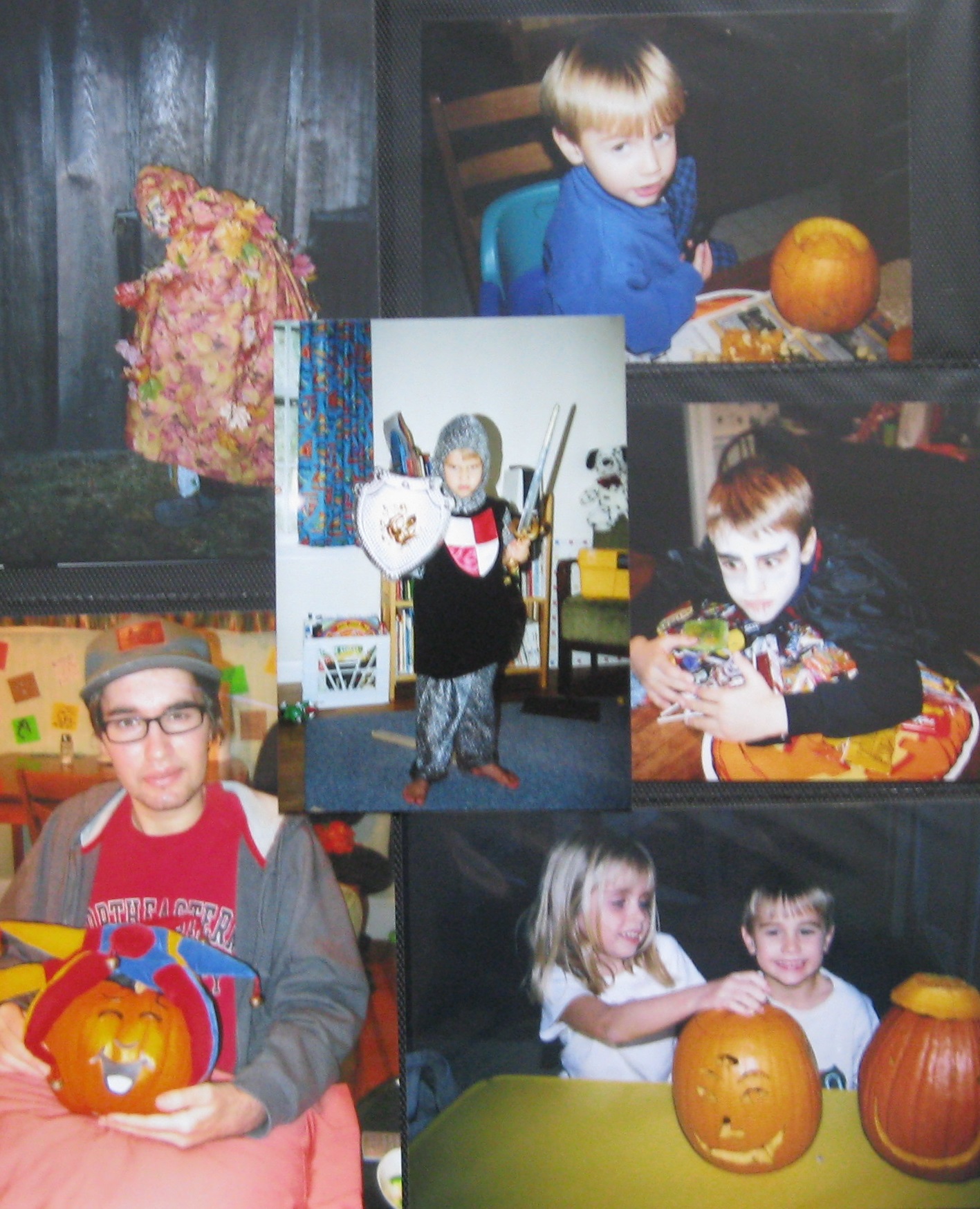 Captions, starting from top left and spiraling clockwise: Sneaking around cloaked in dead leaves; looking cute and innocent; hoarding sweets with a vampire’s sweet tooth; smiling faces; smiling his way through the last Halloween of his life here;ever ready to engage in battle.
