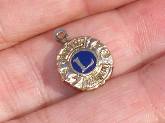 After spending an hour picking and cleaning dandelion greens to make a salad, I went out for a walk. At the corner of Middle Road and Balsam Drive, I saw a shiny object laying on the sidewalk. It was a tiny gold metal charm shaped like a flower. Neither bronze, nor silver, but gold. In the center was a gold letter L, surrounded by a circle of blue enamel. I saw the faces of two roaring lions and read the word LIONS at the top and the word INTERNATIONAL at the bottom.