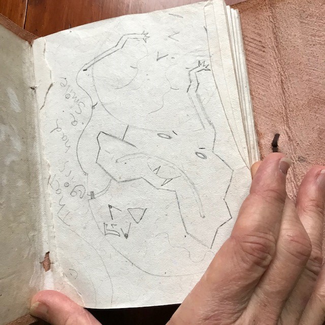 The first page had been torn out of the book, however, on the next page was an abstract drawing of strange faces and creatures. The drawing was simple, yet expressive, making it open to interpretation.